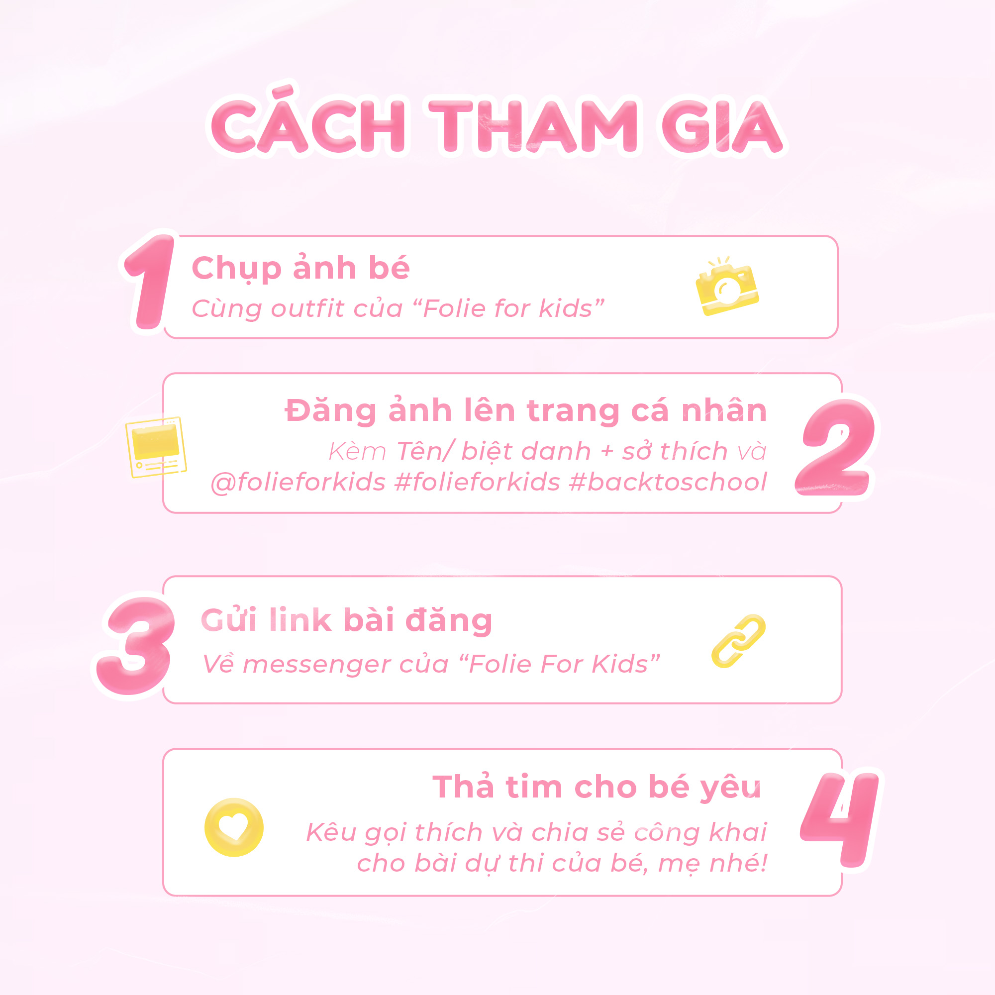 𝐵𝑢̛𝑜̛́𝑐 2: Ba mẹ đăng tải bức ảnh của bé lên trang cá nhân với nội dung như sau - Tên/ Biệt danh của bé + sở thích của bé - Tag tên "Folie For Kids" + hashtag #folieforkids #backtoschool
