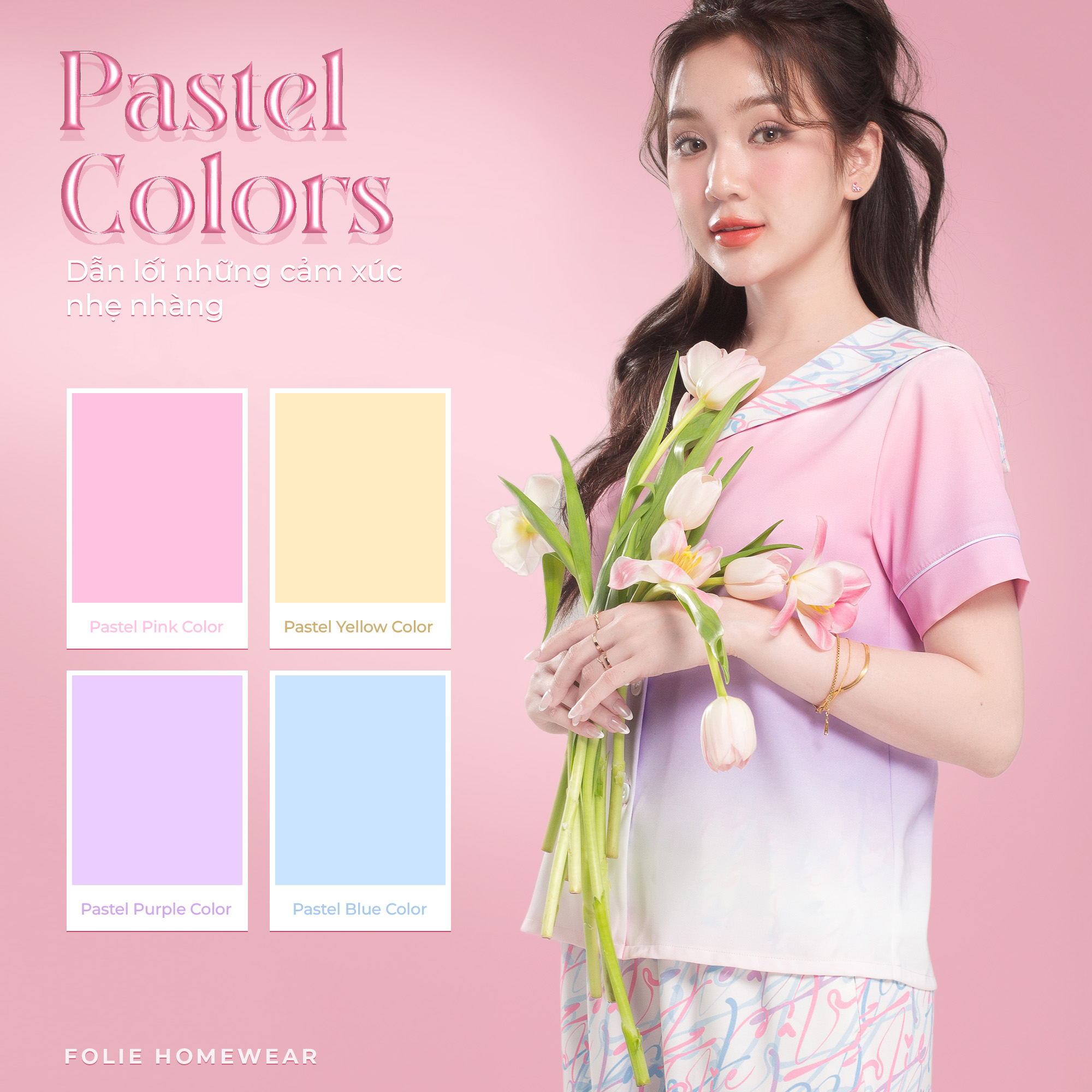 Những ngọt ngào khẽ ghé vào tai, những yêu thương gửi đến nàng bằng gam màu vàng kem, màu hồng pastel tượng trưng cho tình yêu ngọt ngào, niềm hạnh phúc và tinh thần lạc quan, luôn yêu đời. Các gam màu như xoa dịu những tia nắng chói chang trong lòng, mang đến sự tươi tắn, rạng ngời cho người mặc, và lan tỏa sự dễ chịu đến người đối diện nàng.