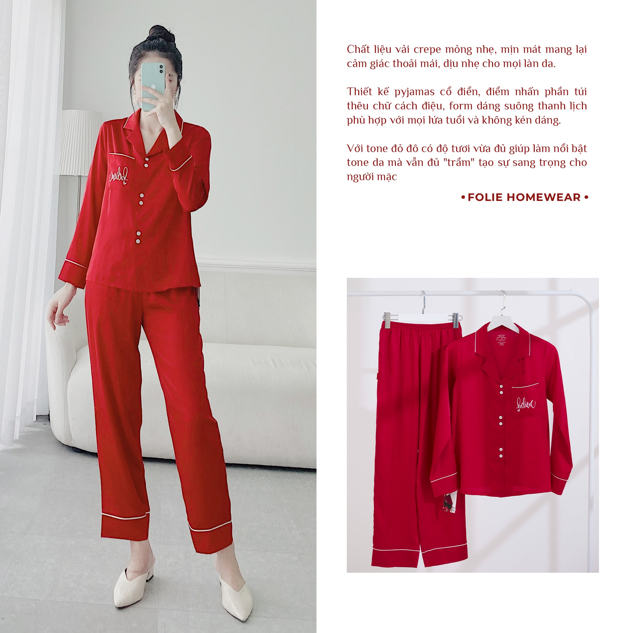 - Set đồ bộ nữ FB89.3 gồm: 1 áo tay dài gài nút màu đỏ lụa crepe, 1 quần dài lụa crepe màu đỏ